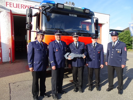 Der bisherige Kommandant Christian Buchberger (Foto 2. von links) kandidierte bei der Wahl am 28.Juni.2019 nicht mehr und übergab nun für die nächsten sechs Jahre den Führungsschlüssel an den neuen Kommandanten Andreas Beck (3. von links) und seinen neuen Stellvertreter Michael Hierl (2. von rechts).