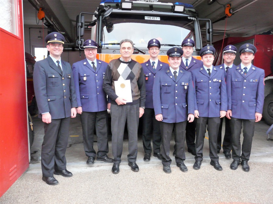 Geehrte und Beförderte der Feuerwehr Oberhaunstadt mit Josef Huber (links) und Kommandant Christian Buchberger (2. v. l.)